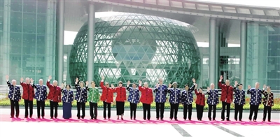 | 2001年10月21日,亚太经合组织第九次领导人非正式会议在上海举行。这是江泽民同志与参会的经济体领导人合影。 |