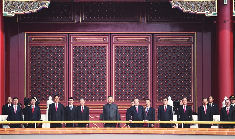 | 2019年10月1日,庆祝中华人民共和国成立70周年大会在北京天安门广场隆重举行。这是习近平同志、江泽民同志、胡锦涛同志等在天安门城楼上。 |