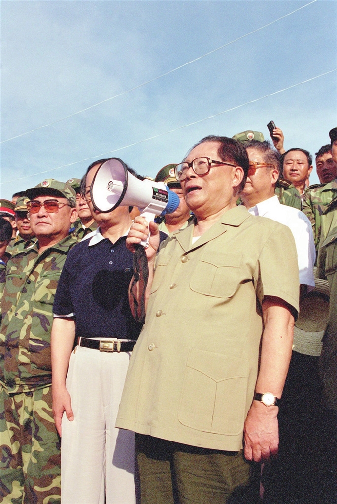 | 1998年8月13日至14日,江泽民同志亲赴湖北长江抗洪抢险第一线,看望、慰问、鼓励奋战在抗洪抢险第一线的广大军民,指导抗洪抢险斗争。这是8月13日江泽民同志在洪湖市乌林镇中沙角险段大堤上,向正在抗洪抢险的军民发表讲话。 |