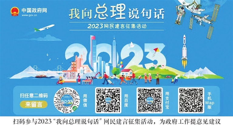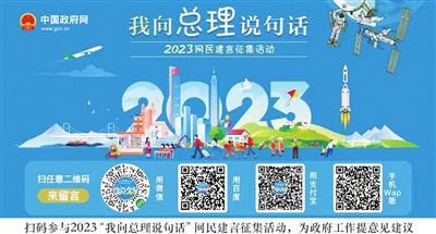 为深入贯彻落实党的二十大精神,本次活动设“构建高水平社会主义市场经济体制”“市场主体和营商环境”“教育和人才”“科技与创新”“全面推进乡村振兴”“实施就业优先战略”“健全社会保障体系”“推进健康中国建设”等14类话题。网民可登录中国政府网,国务院App,国务院客户端微信、百度、支付宝小程序,以及各相关网站和平台留言。部分有较高参考价值的建言将报送《政府工作报告》起草组,并转有关地方和部门研究处理。