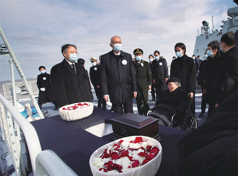 中午12时35分,扬州舰抵达长江入海口水域。在军舰甲板上,送别的人们,肃立默哀。水天肃穆,波翻浪涌。蔡奇和江泽民同志的夫人王冶坪等亲属,眼含热泪,强忍悲痛,将江泽民同志的骨灰和缤纷的花瓣一起缓缓撒向无垠的江海。