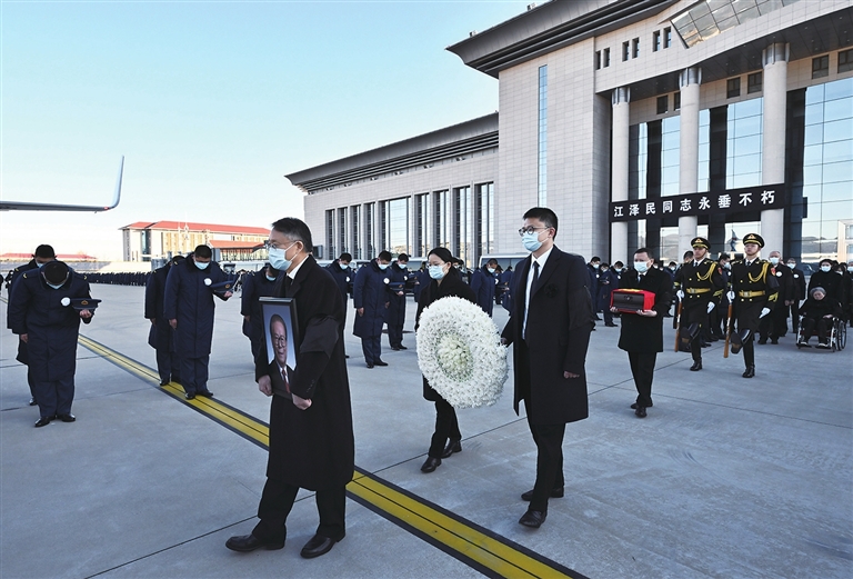 灵车缓缓驶入西郊机场。松柏静立,远山静默。空军官兵列队脱帽,目送载护江泽民同志骨灰的专机起飞。专机盘旋着,在首都北京上空缓缓绕飞一周,告别这一江泽民同志为党和国家事业倾尽心血的地方。