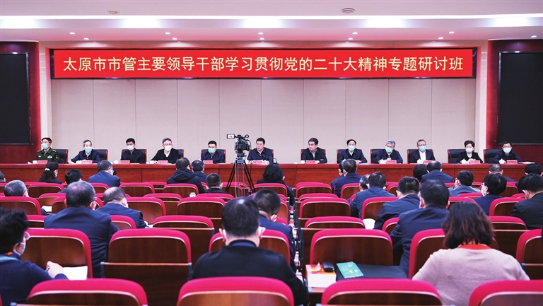 韦韬指出,党的二十大是在全党全国各族人民迈上全面建设社会主义现代化国家新征程、向第二个百年奋斗目标进军的关键历史时期召开的一次重要会议,事关党和国家事业继往开来,事关中国特色社会主义前途命运,事关中华民族伟大复兴,事关人民美好生活向往的实现。市管主要领导干部必须带头学习贯彻党的二十大精神,先学一步、学深一层,更好武装头脑、指导实践、推动工作。要深刻领会党的二十大的重大意义,全面把握党的二十大在政治上、理论上、实践上取得的一系列重大成果,坚决贯彻党和国家事业发展的大政方针,切实转化为太原全方位推动高质量发展的具体举措、实际成效。要深刻领悟“两个确立”的决定性意义,始终在思想上政治上行动上同以习近平同志为核心的党中央保持高度一致,牢记再现“锦绣太原城”盛景的殷殷嘱托,始终沿着习近平总书记指引的方向勇毅前行。要深刻领会“两个结合”,运用好习近平新时代中国特色社会主义思想的道理学理哲理、立场观点方法,把党的创新理论贯彻落实到全方位推动高质量发展的全过程各方面。要深刻领会“中心任务”,深入理解中国式现代化的中国特色和本质要求,准确把握全面建设社会主义现代化国家的战略安排和重大原则,在以中国式现代化全面推进中华民族伟大复兴的征途中展现太原作为。要深刻领会“第二答案”,坚持“两个永远在路上”,认真贯彻新时代党的建设总要求,弘扬伟大建党精神,一以贯之深化全面从严治党,建设清廉太原,为推动各项事业发展提供坚强政治保障。要深刻领会“时代要求”,团结带领全市广大党员干部群众,心往一处想、劲往一处使,在党的旗帜下团结成“一块坚硬的钢铁”,齐心协力推动党的二十大精神落地落实。
