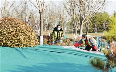 12月13日,太原植物园的园林工人给园内植被安装防风罩,修剪树枝,保障树木安全过冬。 牛利敏 宋卫东 摄