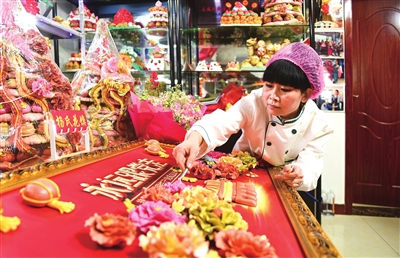 施彩的颜料是杨春梅多年摸索的“独家秘方”。她巧妙利用水果、蔬菜特有的天然颜色,经过特殊的工艺,让馍的色泽更加喜庆,更具北方特色。