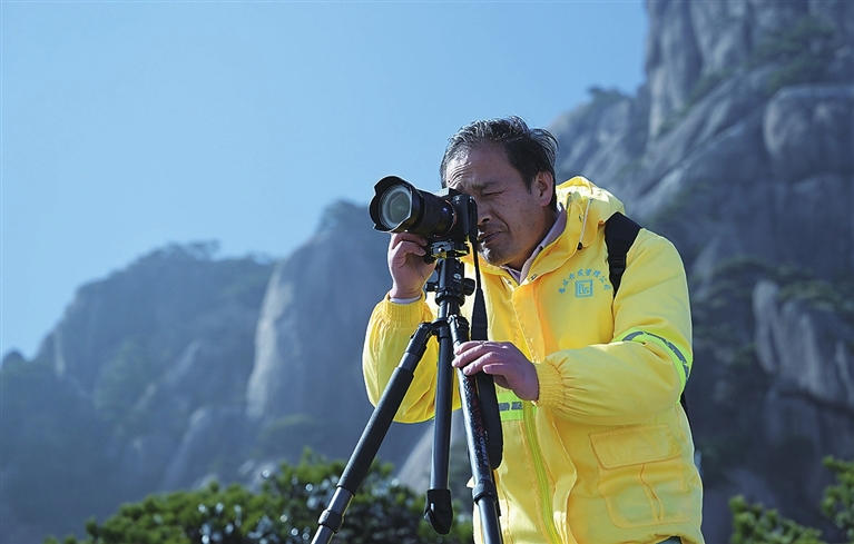 李培生是黄山风景区玉屏环卫所的一名放绳工,常年攀爬在悬崖峭壁间清理垃圾或帮助游客捡拾失物。三年前,李培生开始接触摄影,他与胡晓春曾住在同一宿舍,两人是好友,经常会交流摄影心得。