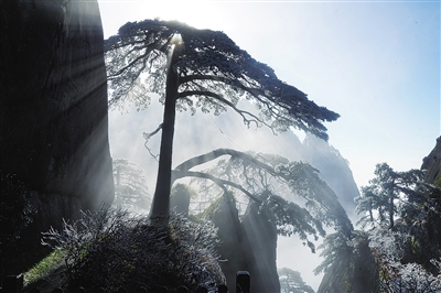 冬日清晨的黄山,阳光从玉屏峰和天都峰之间穿梭而来,透过迎客松的树冠形成一道道光柱,胡晓春和李培生拍摄了这难得一见的美景,分享到各自的朋友圈。