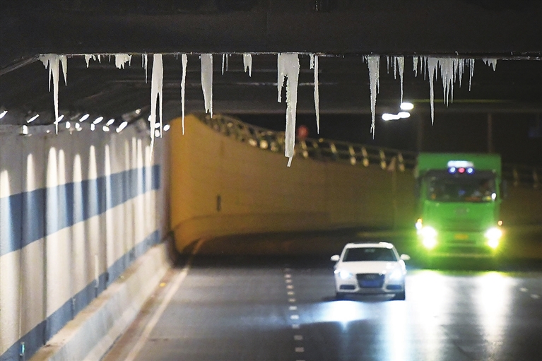 12月19日,迎泽大街下穿火车站通道内,车辆从冰锥下驶过,存在安全隐患。邓寅明 摄