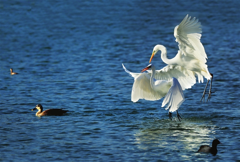 12月20日,汾河景区湿地公园内,来这里越冬的白鹭在水面上嬉戏觅食,为冬日的太原增添了灵动与野趣。 记者 宿晓健 摄