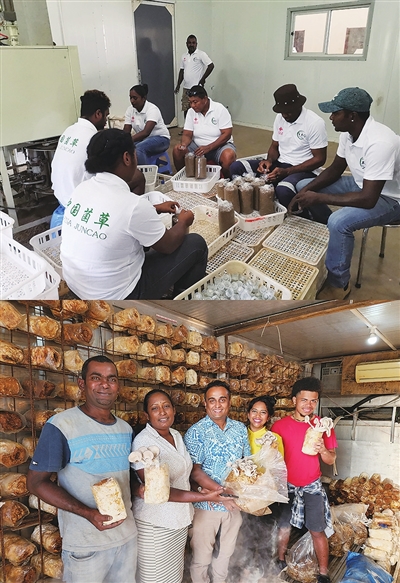 上图:2021年2月17日,斐济员工在位于楠迪市的中国援斐菌草技术示范中心车间里工作。