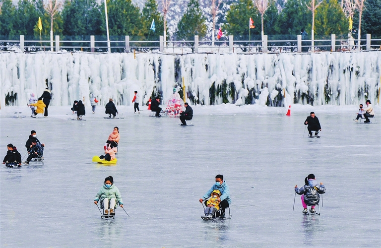 1月2日,汾西北路池塘冰面上,市民竞相追逐,享受着冬日乐趣。 记者 邓寅明 摄