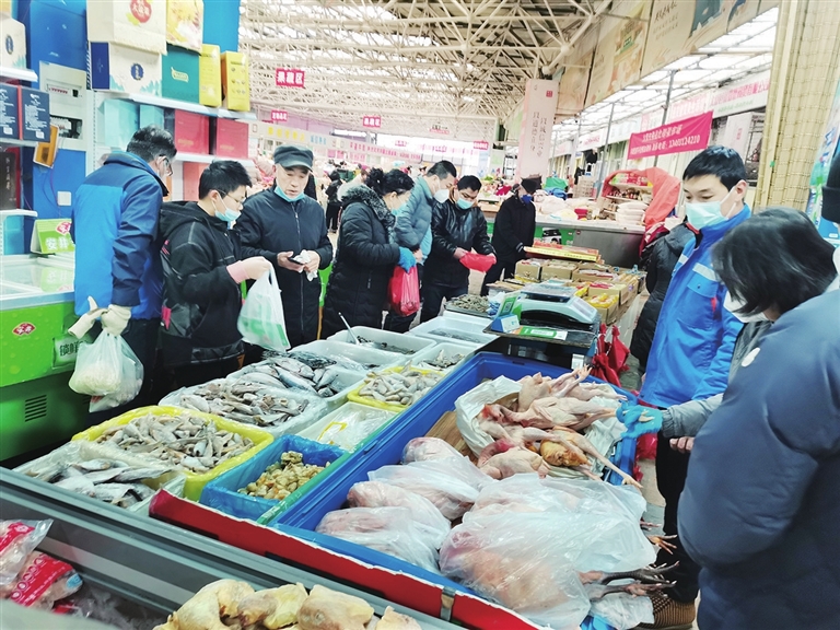元旦期间,节日市场货丰价稳,图为市果品北部菜市场内海鲜销售区内,市民正采买各类产品。 李晓琳 摄