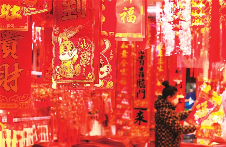 1月4日,尖草坪区某批发市场里节日气氛浓厚,充满年味的春联、福字等节庆用品成为人们购物的首选。 王韵菲 摄