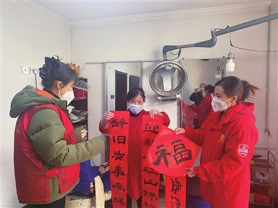1月4日,文庙街道新城北街社区网格员李晶发挥书法特长,泼墨书写新春对联。随后,社区工作人员将对联送到居民家中,送出对大家的祝福。 侯慧琴 刘向蕊 摄