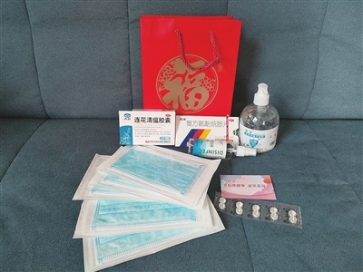 “大姐,这是咱街道党工委送给您的防疫大礼包……”当天上午,老军营小区二社区网格员郭丽、权丽骞将红色“福袋”送上门,并关切地询问居民身体和生活情况,嘱咐其外出时做好防护。劲松社区工作人员还为受赠居民详细讲解具体用药办法,并告知卫生服务站的联系电话,叮嘱居民用药过程中有不清楚之处就及时咨询。