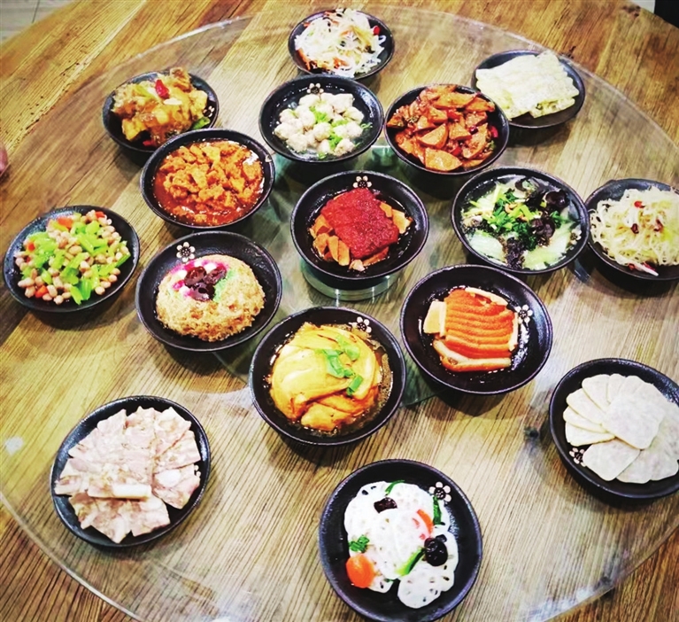 操作间内,几位系着红色围裙的厨师正在灶台边穿梭忙碌着,灶台前,呼呼鸣奏的炉火映红了厨师们的脸庞,案板上丁丁当当作响的切剁声,交织成一曲美妙的乐曲。随着浓烈的香味氤氲在空气中,很快,生烧肘子、蒸肉条、清蒸丸子、烧豆腐、拔丝山药、八宝饭等八碟八碗,摆上大的操作台上,阵阵香气夹杂着浓浓的年味扑面而来,令人垂涎欲滴。