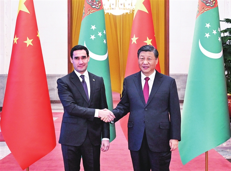 习近平指出,这是你就任总统后首次访华,今天又是中土建交纪念日,我们全面谋划中土关系下一步发展,共同宣布将两国关系提升为全面战略伙伴,意义重大。中国共产党正在团结带领全国各族人民以中国式现代化全面推进中华民族伟大复兴,土方正在积极推进土库曼斯坦复兴战略。中土两国理念相通,目标相似,利益相连,在发展振兴路上要携手努力,发挥互补优势,深挖合作潜力,实现共同发展。中方愿同土方一道,持续深化中土全方位合作,推动构建中土命运共同体,使两国关系在更高水平上向前发展。