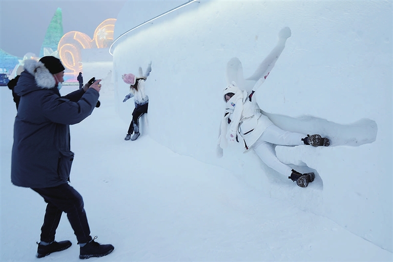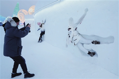 近日,许多游客来到哈尔滨冰雪大世界,在一面有着数十个不同造型人形凹槽的雪墙前“打卡”留影。