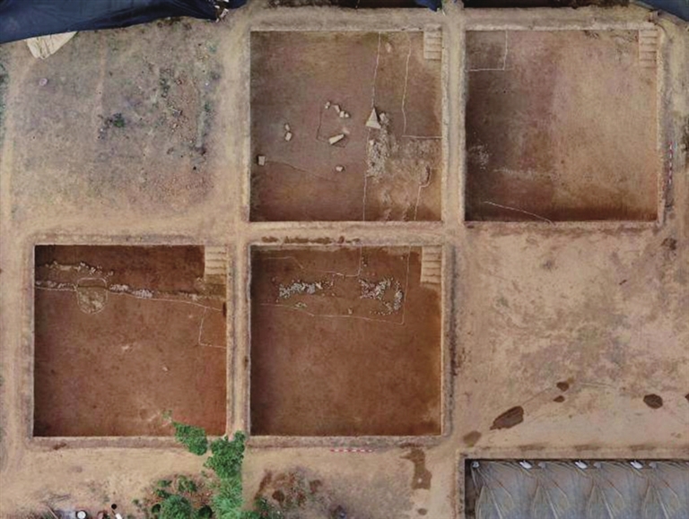 发掘成果表明,“钟虡”位于封土和“石殿”的东南侧,由一处台基式建筑、一处房屋建筑和两列四排方形磉墩组成。台基式建筑呈南北向长方形,夯土台基内部发现南北排列的大型石柱础,柱础边长0.9米,距现存台基顶部约2.2米,故推测该建筑为悬挂大型乐钟所设,应为陵园内的礼制建筑——“钟虡”。