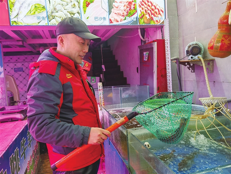 “我要两条鲈鱼……”一名女士走进来。刘保军用网子捞出鱼,熟练地宰杀收拾完毕。“我开门到正月初五,您可以提前买好水产海鲜,我给您免费代养,从腊月二十九到正月初五,您不用冷冻,可以随时吃到最新鲜的食材!”刘保军不失时机地推荐店里刚刚推出的新服务——代养水产海鲜。这一服务明显勾起了顾客的兴趣,询问详细情况。