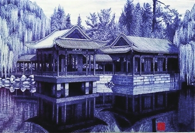 用圆珠笔作画,本身就是对绘画技巧的一种考验。“最难得在于每一笔都不可逆,但优点是圆珠笔可以画出清浅的蓝色,我画的时候都是用笔尖,微微擦碰纸面均匀地排线,很考验腕力。”
