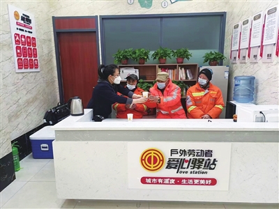 早上9时,爱心驿站准时开放。管理员闫茜不停地忙活着。烧上热水,把领回来的口罩、创可贴摆放好,又忙着收纳架上的图书。小小的爱心驿站布置得井井有条,站内设施一应俱全。“饭凉了,驿站内有微波炉加热;渴了,随时有开水供应;累了,可以边休息边看看书报,再也不用为上厕所发愁了。”闫茜笑着说:“我们努力把这里打造成户外劳动者的温馨之家。”快递员小李经常到爱心驿站来“加油充电”,说起这里的贴心服务,也忍不住点赞。