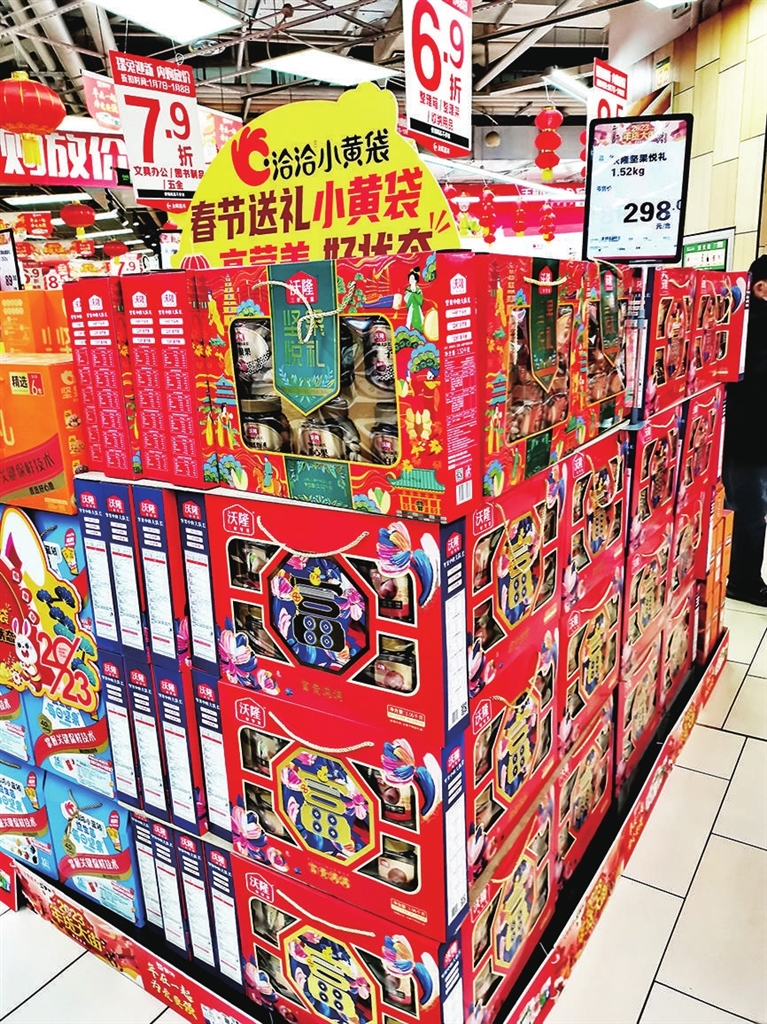 新春佳节是走亲访友送礼的高峰时段,记者走访市场时看到,市内各大商超中“年货一条街”里各种年货礼盒摞得很高,干果、软糖、糕点、零食应有尽有。从外包装看,经济实惠的礼盒成为“主流”。比如,某超市一款售价158元的坚果礼盒,重1.06kg,内含6罐坚果、零食,罐罐内容饱满。
