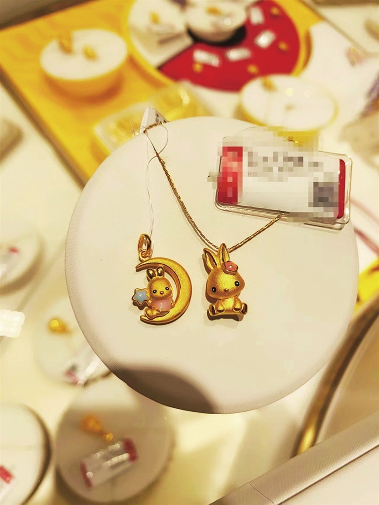 多家知名品牌的金店内,均有售卖兔子元素的金首饰,兔子元素被融入黄金吊坠中,显得“软萌可爱”。记者看到专柜内放着各式各样的首饰,有戴着虎头帽的“拜年兔”、有坐在月亮上的“奔月兔”,有扎着多个耳朵眼的“朋克兔”……一名店长介绍,从近期的销售数量上来看,以兔年生肖类的黄金饰品能够占到该店当月销售额的40%以上。
