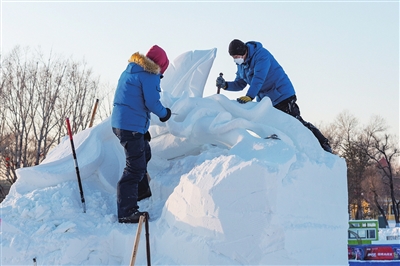 1月10日,在哈尔滨太阳岛雪博会园区,参赛选手进行雪雕创作。