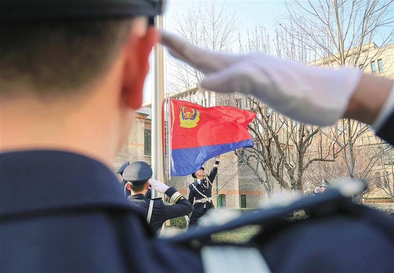 1月10日上午10时,公安部举行升警旗仪式庆祝第三个中国人民警察节。部机关干部代表整齐列队,向中国人民警察警旗庄重敬礼,齐声高唱中国人民警察警歌,重温公安机关人民警察誓词。 新华社 发