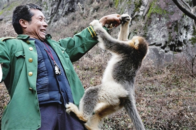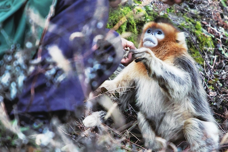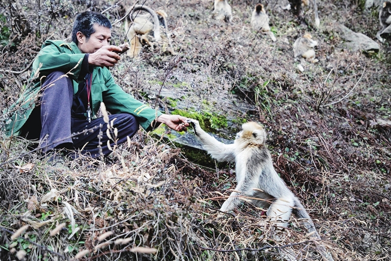 杨忠录与大熊猫国家公园甘肃省片区裕河园区内的川金丝猴互动(1月4日摄)。
