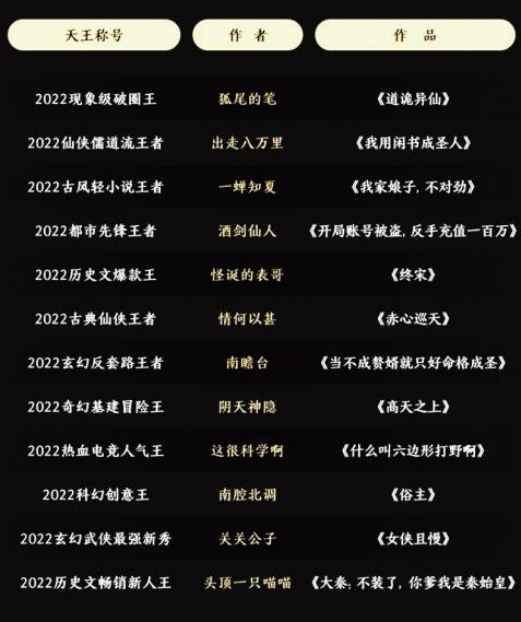 为鼓励多元创作,激励新人作家勇于创新,“十二天王”的评选十分注重品类的拓展或题材的创新,并关注各赛道涌现的新人,2022年的评选也延续了此前题材多元、创新拓展、引领趋势的特点。