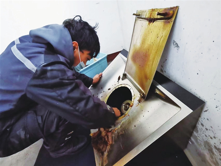 打开工具箱、拿出电动螺丝刀,康瑞峰动作娴熟地将油烟机上的螺丝逐个取下,放在身旁的一个小塑料盒里。打开挡板后,看到蜗壳里厚厚的油污,康瑞峰拿起铲刀清理起来。他说:“咱北方人做菜喜欢爆炒,产生的大量油烟容易吸附在涡轮和滤网、蜗壳里。一般情况下,油烟机每年要进行一次深度清洗,这样才能保证电机的正常转速,快速排放油烟。”闻听此言,站在一旁的范先生连连点头感慨道:“我们平时自己也擦洗油烟机,但只能清洁一下表面,要想彻底清洗,还得请你们专业的人来干。”“我们靠的就是这技术吃饭,术业有专攻嘛。”康瑞峰抬起头笑着说。