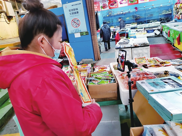 “家人们,发福利了,真空包装的深海黄花鱼35元一条,快来抢购。”临近中午,市场里的人流量多起来,颜现芳赶快将手机支架支在货摊前,在抖音直播间开启线上线下同步卖货模式。循着她的声音,现场不少顾客迅速“围观”挑货,线上销售也跟着沾光,“家人们”纷纷向主播了解商品信息。