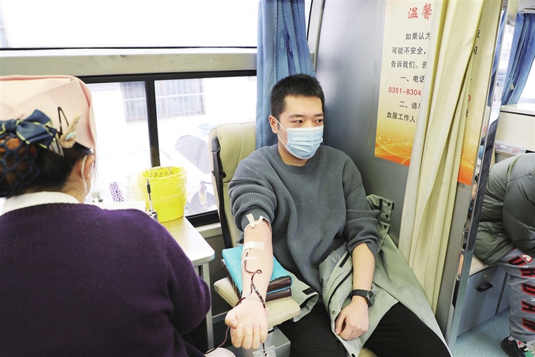 1月12日,晋源区检察院联合区法院、公安分局开展了无偿献血活动,大家踊跃报名、积极参与,献血现场温情流动,暖意融融。图为检察干警在献血。 刘友旺 李玉峰 摄
