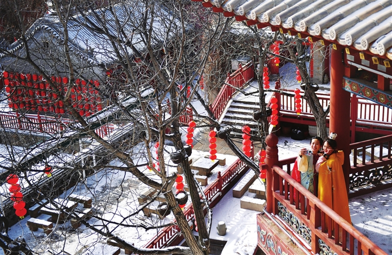 1月14日,刚刚恢复开放的太山景区被白雪覆盖,游人们赏雪嬉戏。当日,景区开展了“玉兔纳福踏春来”系列活动,包括迎春书法展、民俗表演等内容,成为市民休闲游玩好去处。
