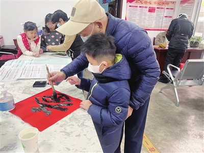 1月12日上午,207所社区邀请辖区空巢老人和留守儿童来到社区,为大家写春联、剪窗花、做花灯,一老一小其乐融融。 韩睿 韩艳 摄
