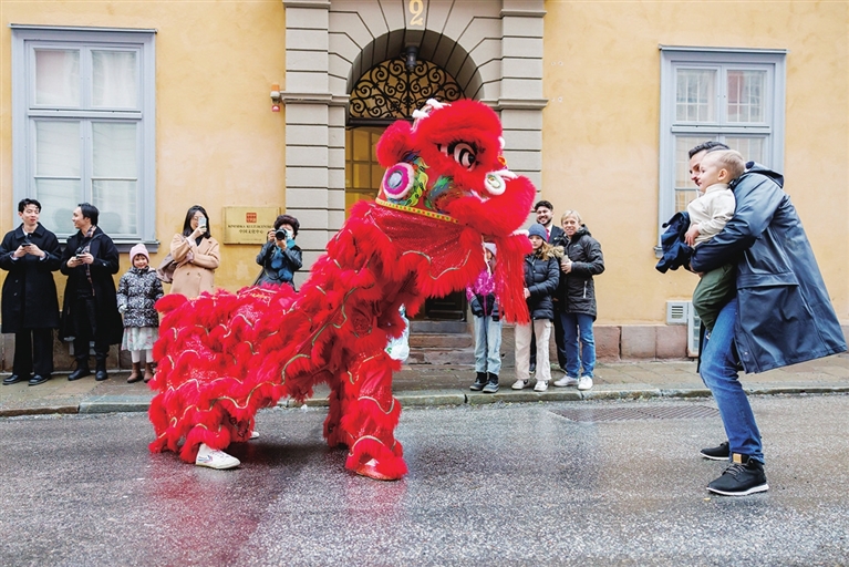 1月14日,人们在瑞典斯德哥尔摩中国文化中心外观看舞狮。