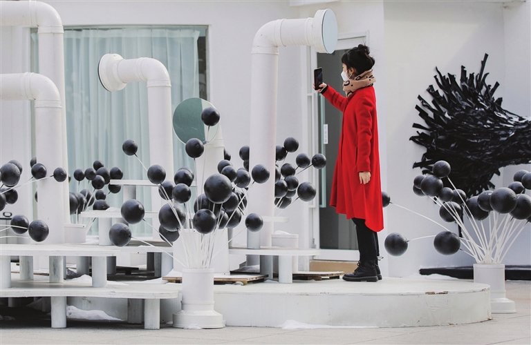 1月17日,一组以“跳动的心脏”为主题的黑白装置艺术作品在森林公园展出,吸引了年轻人前来观展。 王韵菲 摄