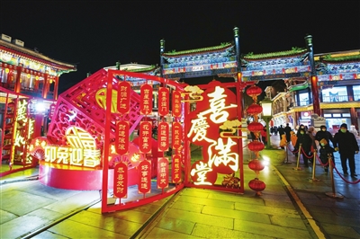 春节临近,北京街头的春节及元宵节景观陆续布置完成。据了解,北京市在全市大街小巷、居住小区、社区村庄,公园景点、商圈、产业园区等重点区域,共悬挂灯笼灯饰及各类装饰22万余件,布置缠树灯约130万延米,布置户外广告设施200余处,营造出喜庆热闹的节日氛围。 新华社 发