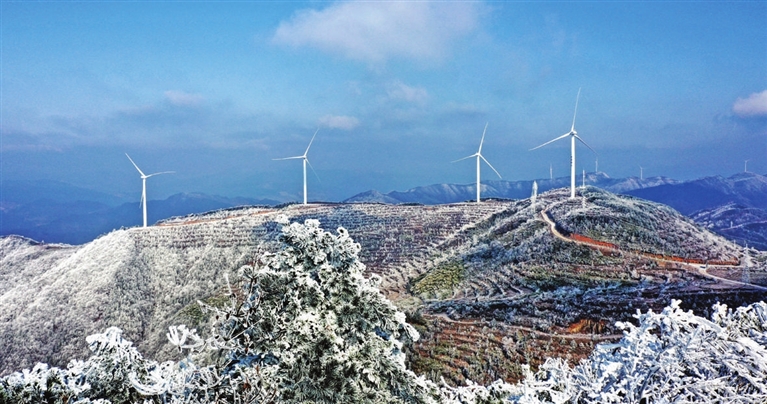 1月16日,浙江省金华市磐安县一风电场雪后初霁(无人机照片)。