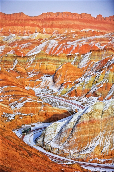 甘肃张掖七彩丹霞在白雪的映衬下显得格外艳丽(1月15日摄)。