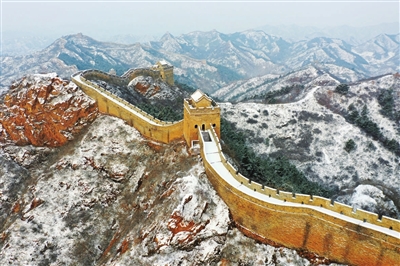 1月13日在河北省承德市滦平县拍摄的金山岭长城雪景(无人机照片)。