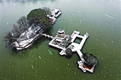 1月15日拍摄的安徽省铜陵市天井湖雪景(无人机照片)。