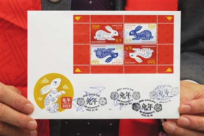 中国驻匈牙利大使馆、匈牙利经济发展部、布达佩斯中国文化中心与匈牙利邮政局16日在匈牙利邮票博物馆共同举行中国农历兔年生肖邮票发行仪式。此次发行的兔年生肖邮票由匈牙利平面艺术家毛罗什·克里斯蒂娜设计,共发行2万枚小型张,每枚小型张由4枚邮票构成。邮票采用四角对称构图方式,以红白两色为背景,描绘了与青花瓷同色调的两对小兔子,并以中匈两国文字标识出“兔年”主题。 新华社 发