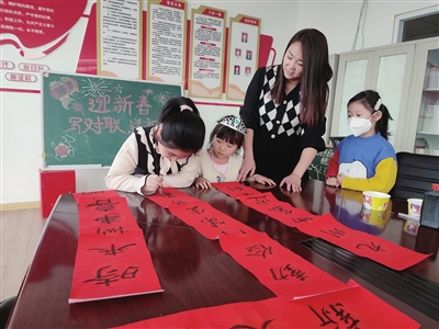 写春联,过新年,红红火火迎新春!1月18日下午,察院后社区组织辖区青少年开展“迎新春 写春联 送祝福”活动。活动现场,孩子们学着大人模样,挽起袖口,挥毫泼墨,写下一副副散发着清新墨香的春联。真诚的祝福寄语字里行间,表达着孩子们对美好未来的憧憬和向往。 郭晓华 宋玉琴 摄