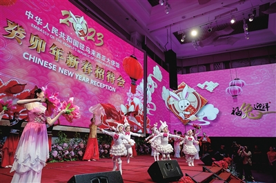 在中国农历新年来临之际,中国驻外大使馆举办春节招待会,当地政府官员、各界友人、华侨华人、中资机构和留学生代表等欢聚一堂,共庆兔年新春,共话交流合作,共祝双边关系迈上新台阶。 新华社 发