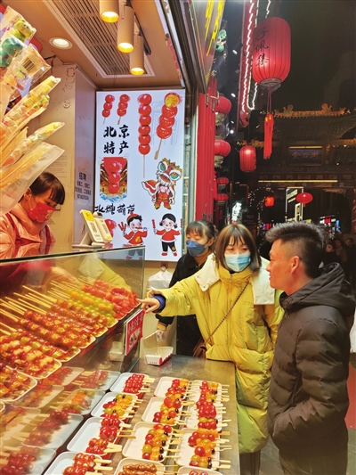 “选果、穿果、熬糖、蘸糖、冷却。每一步都能让冰糖葫芦有高下之分。穿果工艺也是有讲究的,最下面的果子最小,往上依次变大,七八个果子穿一串。”店员小张一边娴熟地穿果,一边与记者聊了起来,“有一种果子一串的,有几种果子一串的,什锦的可以自己搭配,既要颜色漂亮,又要口感好。如橘子、猕猴桃这些较软的水果下面可以穿一个山楂作为底托。”