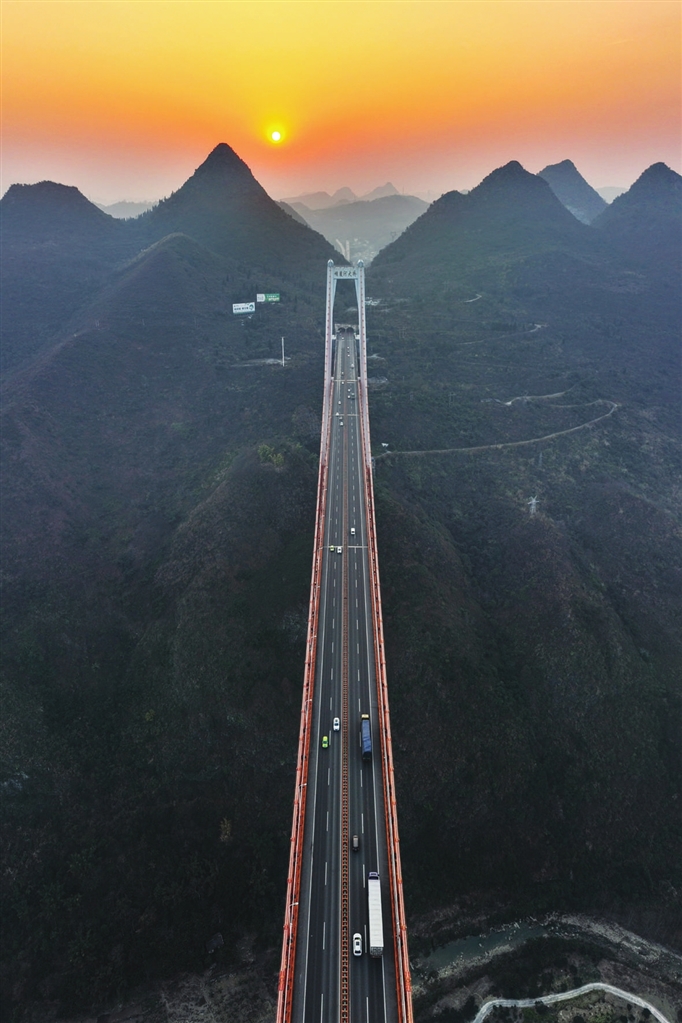 当日,贵州坝陵河大桥沐浴在夕阳余晖下,美不胜收。 新华社 发