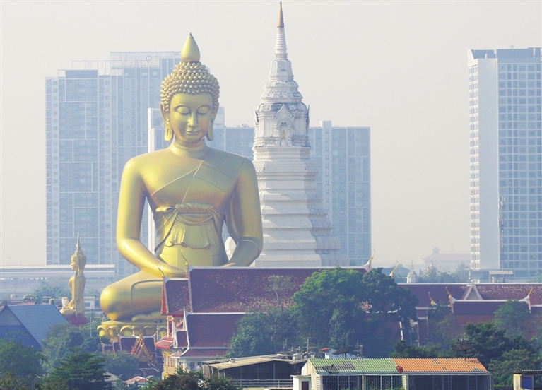这是2月1日拍摄的被雾霾笼罩的泰国首都曼谷的大佛。